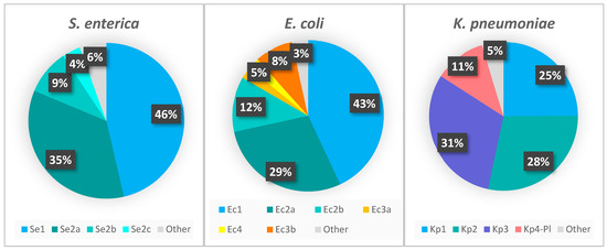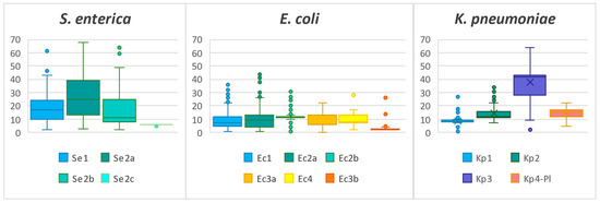 In the isolates possessing the CRISPR loci, the average number of spacers per genome was 34.09 for S. enterica, 22.67 for E. coli, and 27.24 for K. pneumoniae, respectively (Table 1). We used the annotation locus/DR for the statistical analyses of those loci presenting a specific direct-repeat sequence. A total of 1280 genomes of S. enterica were found to carry CRISPR loci, with an average of 15.46 spacers for Se1/1a, 8.00 for Se2a/1a and 23.38 for Se2b/1a. In the 1901 genomes of E. coli possessing CRISPR loci, the ones that were most frequently found were Ec2a/1a, Ec1/1a, and Ec2b/1b, with an average number of spacers of 5.94, 5.24, and 2.21, respectively. CRISPR loci were identified in 293 K. pneumoniae genomes, with the highest number of spacers observed for the loci Kp1/1a, Kp2/2a and Kp3/3b, with average values of 16.17, 6.78, and 3.06, respectively (Supplementary Table S2).