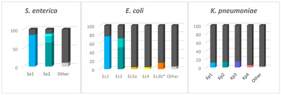 The CRISPR-Cas system has been previously used in S. enterica to determine the CRISPR loci polymorphism and to differentiate between the different serotypes in case of outbreaks. Two CRISPR loci have been identified [20,21] and the different constructions of the system have been attributed to a few serovars [20]. Although the spacer composition has been reported to be correlated with the S. enterica serotypes, we are unable to determine such a relationship in our work; in the case of most of the genomes included in this study, the serotype information is not provided in the database that we used. Previous studies also developed primers to amplify the CRISPR loci from S. enterica [18,43], E. coli [36,37], and K. pneumoniae [44,45], by targeting the adjacent genes of the system and the cas genes. Since then, a large number of genomes have been added to the public genome repositories for these species. It is important to note that the primers designed in this study were based on a larger number of genome datasets than those from past studies, allowing us to design the primers from directly adjacent regions of the CRISPR loci, enabling the identification of polymorphism occurring in each system. It would be of future interest to infer the serotypes and/or sequence types of the bacterial strains, employing the relevant genome-based typing methods prior to extracting the CRISPR systems using our highly efficient primers, to allow further exploration of their potential role as a molecular epidemiological marker.