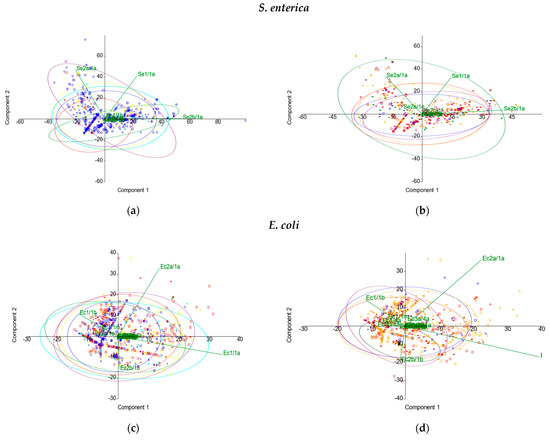 In the principal component analysis (PCA), no distinct clustering was observed by geographical origin or isolation source types for any of the enterobacterial taxa. For S. enterica, most of the genetic variation was explained by the first two principal components among locations (86.45% of the total variation) (Figure 5a) and also among sources (88.42%) (Figure 5b). For E. coli, the first two principal components contributed to 66.68% of the total variation concerning geographical origin (Figure 5c) and to 63.11% for isolation sources (Figure 5d). For K. pneumoniae, the first two principal components accounted for 93.48% of the various locations (Figure 5e) and 94.06% among source types (Figure 5f). Furthermore, for all the three species investigated during this study, the multivariate nonparametric permutational analysis of variance (PERMANOVA) revealed significant differences (p < 0.001) between populations according to geographical origin, as explained by differences in the dispersion of CRISPR elements (Welch’s F-test, p = 0). When assessing the variance between populations according to the isolation source, no differences were observed in the variances of CRISPR elements for E. coli and S. enterica. Nevertheless, although the PCA indicates a similarity in their CRISPR system diversity, environmental and human-derived K. pneumoniae strains differ significantly (PERMANOVA, p < 0.001), due to the heterogeneity of variance. The PCA analysis simplifies the high-dimensional data, offering an integrative view of the CRISPR components involved in variation. Thus, the great diversity of CRISPR patterns was reduced in dimensionality, and data interpretation increased. In S. enterica, the major loadings were set by Se2b/1a, Se1/1a, and Se2a/1a for PC1, and Se2a/1a and Se1/1a for PC2, respectively. For E. coli, Ec1/1a and Ec2a/1a had major loadings for PC1, while Ec2a/1a and Ec2b/1b were the major contributors for PC2, respectively. In K. pneumoniae, Kp1/1a and Kp2/2a were the major contributors in PC1, while Kp2/2a and Kp4/3a were the major contributors in PC2, respectively.