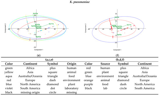PCA analysis by (a,c,e) geographical origin and (b,d,f) isolation source types.