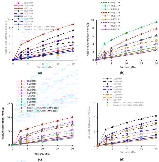 Similar trends were noted for gas adsorption on II-B (Figure 1b), II-C (Figure 1c), and II-D (Figure 1d), i.e., the increase in adsorption with the increase in pressure. At a low-pressure, the relative adsorption capacities were higher than in the high-pressure range, which can be attributed to the fact that the highest adsorption energy is found in the smallest pores at low pressure at first and then advances toward the larger pores with increased pressure, which in turn decreases the isosteric heat of adsorption []. This observation is an indication of pore filling by physisorption in microporous material, as first recommended by Dubinin []—a small increase in adsorption with a further increase in pressure until equilibrium is established. As a comparison, in the literature data from Zhao et al. [] for similar kerogen (without nanopores), the two data points for II-A, II-C, and II-D (at 5 MPa and 323 K and 10 MPa and 323 K, plotted in Figure 1a,c,d) indicated a relatively lower adsorption capacity under similar conditions compared with our results. This underestimation could be attributed to the absence of nanopores with major control over the adsorption behavior, and thus the presence of nanopores (as in our models) suggests greater adsorption capacity.