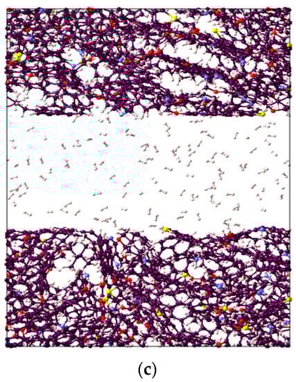 A few previous MD simulation studies [,] have been carried out to develop the condensed kerogen using a large-scale atomic/molecular massively parallel simulator (LAMMPS) []. Polymer-consistent forcefield plus (pcff++) was used in molecular dynamics []; it describes atom dispersion/repulsion (Lennard–Jones potential 6–9), intermolecular, and electrostatic interactions and has been recognized as a reliable forcefield for thermodynamic characteristics [,].