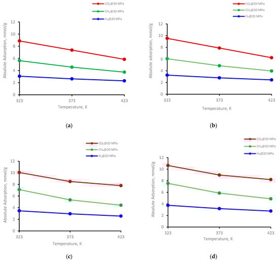 The adsorption behavior on four kerogen structures of the gases (CO2, CH4, and H2) was evaluated at 323 K, 373 K, and 423 K (Figure 3). Clearly, adsorption decreased with increasing temperature for all kerogen structures. For example, at a fixed pressure of 20 MPa for II-A kerogen, the adsorbed amount of CO2, decreased from 8.8 mmol/g to 5.8 mmol/g (i.e., a 66% reduction) when the temperature of the system was elevated from 323 K to 423 K (Figure 3a), indicating a prominent decline. Similar trends were evident for CH4 and H2, i.e., a decline from 5.6 mmol/g to 3.7 mmol/g (↓66%) for CH4 and from 3.0 to 2.9 mmol/g (↓75%) for H2 for the same temperature increment (Figure 3a). At the same temperature range at a fixed pressure of 20 MPa, the adsorption capacity of the gases in other kerogens (II-B, II-C, and II-D) decreased with similar trends, as noted in II-D (Figure 3b–d and Table 1). Thus, the adsorption capacity is sensitive to temperature, and the low-temperature shale gas reservoir demonstrated greater gas storage potential than the high-temperature shale formation. This phenomenon was also observed in shale adsorption tests [,,].