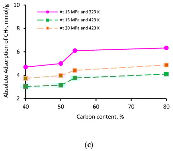 The thermal maturity of a shale sample is known to influence its gas storage capacity. While vitrinite reflectance (Vr) is typically used as an indicator of thermal maturity [], here, we used the elementary analysis of the four kerogen structures to establish the influence of maturity; this is because this study was based on kerogen models as opposed to a physical shale sample. The percentage of aromatic fixed carbon (obtained from NMR []) was lowest in II-A kerogen (40%) and highest in II-D kerogen (80%). Similarly, the XPS analysis demonstrated a similar trend []—the lowest aromatic carbon in II-A (40%) and the highest in II-D kerogen (72%)—consistent with overmature kerogen. Thus, on the basis of these model parameters, kerogen maturity was in the order of II-D > II-C > II-B > II-A. The adsorption capacity of the three gases demonstrated a clear increase with increasing kerogen maturity. This behavior can be attributed to specific functional groups, i.e., H, O, N, and S, and an increase in effective pore volume, as both are correlated with organic matter maturity, which is proportional to adsorption capacities [,,]. Typically, at a particular pressure and temperature, the adsorption capacity followed the trend II-A < II-B <II-C < II-D, and the adsorption capacity increased with increasing carbon content (Figure 4). With an increase in carbon content from 40% to 80%, the adsorption capacity increased from 2.4 to 3.0 mmol/g for H2 (Figure 4a), 7.7 to 9.5 mmol/g for CO2 (Figure 4b), and 4.7 to 6.3 mmol/g for CH4 (Figure 4c) at 15 MPa and 323 K. It is noteworthy to mention that the carbon content develops microporous characteristics in shale and contributes to the surface area and total pore volume. These factors can be attributed to a surge in absolute H2, CO2, and CH4 adsorption above 50% of the carbon content (which can be referred to as the critical carbon content).