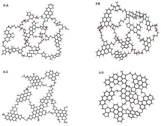 We used four kerogen molecular models of varying maturity, i.e., immature (type II-A), top of oil window (type II-B), middle/end of oil window (type II-C), and postmature kerogen (type II-D) were considered (Figure 5). These models are similar to those of Ungerer et al. [], which were based on the analytical data corresponding to the work of Kelemen et al. []. The chemical compositions of the four kerogen models were C252H294O24N6S3, C234H263O14N5S2, C242H219O13N5S2, and C175H102O9N4S2. Note that such kerogen models exist in the organic-rich shale (e.g., Duvernay marine).