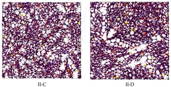 The chemical composition and physical properties of kerogen structures were in good agreement with the experimental data (e.g., X-ray and Nuclear Magnetic Resonance) [], and the percentage of aromatic fixed carbon demonstrated a trend: the lowest aromatic carbon in II-A and highest in II-D kerogen. Thus, the kerogen maturity and porosity were in the order of II-D(overmature) > II-C(Middle and End Oil Window) > II-B(Top of Oil Window) > II-A(immature). The pores size distribution demonstrated that II-D contained the largest micropores, followed by II-C, II-B, and II-A in descending order.