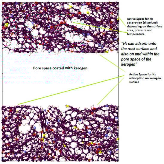 It is worthwhile to note that the overall highest adsorption capacity was noted to be 10.6 mmol/g for CO2 in immature II-D kerogen at 20 MPa and 323 K (Figure 1d). To visualize this better, a nanopore layer model of type II-D kerogen is shown (Figure 2), indicating the adsorption behavior of all gases, and a large cluster of CO2 molecules is evident (Figure 2). In addition, all kerogen structures depicted mainly type I adsorption behavior for gases, consistent with recent findings [,,]. This observation is also in agreement with CO2 and CH4 adsorptions on coal []. In the case of H2 adsorption, however, no attempt on kerogen is available to compare with the results of this study. Note, however, that here, the kerogen has a strong affinity for CO2, i.e., ~1.7 times than CH4 and 4.5 times more than H2, which can be attributed to kerogen functional groups, which have a notable effect on the adsorption of CO2, CH4, and H2 because of their remarkable adsorption energy for CO2 over CH4 and H2 []. It can be noted that kerogens exhibited a small deviation from a type I adsorption behavior for H2 gas. This particular behavior can be credited to the small molecular mass of H2 (2.016 g/mole []) or low density, which promotes the weak intermolecular interaction of H2 with organic matter and affects adsorption thermodynamics, and the associated bonding between adsorbate and adsorbent is a strong function of the density of a gas [].