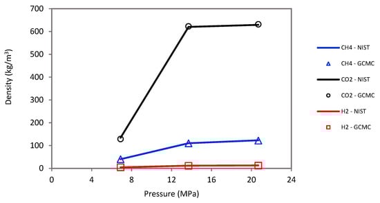 The sorption was simulated by the Monte Carlo (MC) technique using the grand-canonical Monte Carlo (GCMC) approach [,,] under a wide range of pressures (2.75 to 20 MPa) and temperatures (323 to 423 K). Moreover, ASPEN software was used with the Peng–Robinson equation of state to calculate fugacity coefficients of host molecules (i.e., H2, CH4, and CO2) and converted into chemical potential in the GCMC simulation. Note that the host molecules were defined as united atoms. A molecular loading approach was further adopted to validate the molecular simulation, which showed an acceptable match between the empty cell yield density and the experimental NIST data for CO2, CH4, and H2 (see Figure 9).