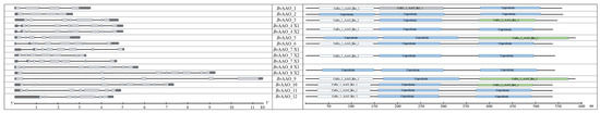 Exon−intron structure (left side) and conserved protein domain family (right side) of AAO genes in Beta vulgaris. UTRs−dark gray rectangles, exons−light gray rectangles, introns−black lines, the first cupredoxin domain of plant ascorbate oxidase homologs−white rectangles, the second cupredoxin domain of plant ascorbate oxidase homologs−gray rectangle, the third cupredoxin domain of plant ascorbate oxidase homologs−green rectangles, cupredoxin superfamily domain−blue rectangles.