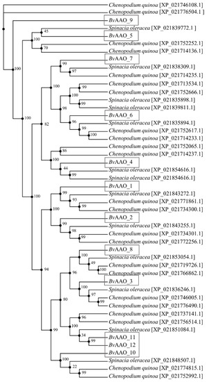 Phylogenetic analysis of AAO genes. Trees were built using amino acid sequences from Beta vulgaris, Spinacia oleracea and Chenopodium quinoa. The linear phylogram was constructed using the neighbor−joining method and bootstrapped 1000 times. Beet AAO genes are marked with gray boxes.