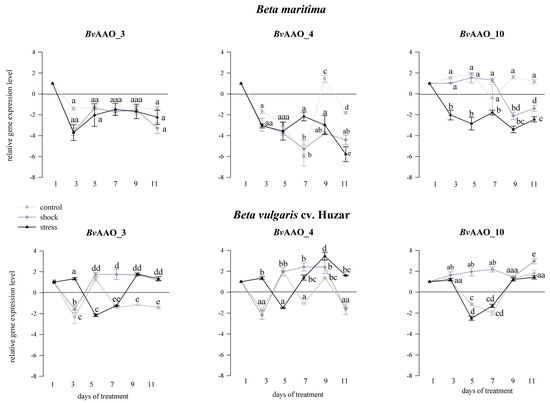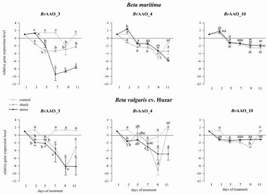 Expression profiles of AAO genes BvAAO_3, BvAAO_4 and BvAAO_10 determined in leaves of Beta vulgaris ssp. maritima and Beta vulgaris cv. Huzar subjected to drought shock or stress. Control−light gray lines, drought shock−gray lines, drought stress−dark gray lines. Different letters denote significant differences at p < 0.01 (ANOVA followed by Tukey’s test). “Whiskers” indicate standard deviation.
