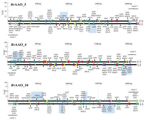 Structure and motif composition of the promoter regions of AAO genes BvAAO_3, BvAAO_4 and BvAAO_10. The analyses were performed on sugar beet sequences derived from the RefBeet-1.2.2 reference genome. CpG islands−light blue squares, selected cis−regulatory sequence elements (TATABOX−red squares, CAATBOX−green squares, WRKY−purple squares, MYB−yellow squares, GATABOX−blue squares) and potential places recognized by specific stress−related transcription factors (bZIP, MYB, WRKY, bHLH, NAC) are shown. “+”−sense strand; “−” antisense strand.