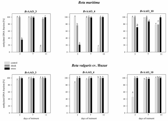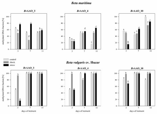 Methylated DNA fraction [%] of CpG islands in the promoter region of AAO genes BvAAO_3, BvAAO_4 and BvAAO_10 determined in leaves of Beta vulgaris ssp. maritima and Beta vulgaris cv. Huzar subjected to salt shock or stress. Control−light gray bars, salt shock−gray bars, salt stress−black bars. Different letters denote significant differences at p < 0.01 (ANOVA followed by Tukey’s test). “Whiskers” indicate standard deviation.