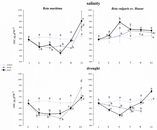 Changes in ascorbate content in leaves of Beta vulgaris ssp. maritima and Beta vulgaris cv. Huzar were tested over a 11-day-long in plants subjected to stress-generating factors or in those maintained under control conditions, which did not involve exposing plants to stress factors. The total ascorbate levels, i.e., the sum of its oxidized and reduced forms, were determined. Leaf total ascorbate concentrations were expressed as µg ASC per gram fresh weight (FW) of leaves and are presented in Figure 9.