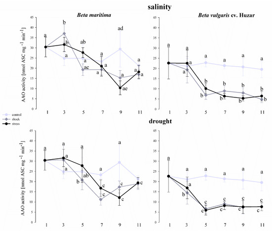AAO activity determined in leaves of Beta vulgaris ssp. maritima and Beta vulgaris cv. Huzar subjected to salt shock or salt stress and drought shock or drought stress. Control−light gray bars, salt shock−gray bars, salt stress−black bars. Different letters denote significant differences at p < 0.01 (ANOVA followed by Tukey’s test). “Whiskers” indicate standard deviation.