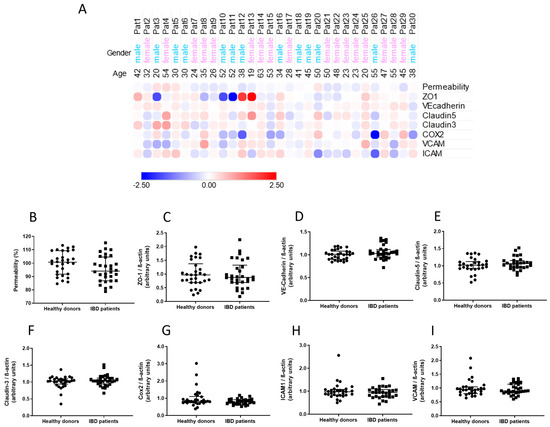 Comparisons between healthy donors and patientsof parameters assessed in BLECs treated with donor plasma. Plasma was obtained from n = 30 IBD patients and 30 healthy donors matched by age and sex. BLECs were treated with 10% plasma for 24 h and permeability to NaFlu, and expression of proteins by Western blotting were assessed. An initial comparative analysis of these parameters was carried out, and results are shown as a bubble heatmap evidencing log2 fold-changes of assessed parameters for IBD patients in comparison to healthy donors (log2 fold-change magnitude represented in the bar below the graph) (A). Further comparisons of paired data were carried out for all parameters assessed: permeability (B), expression of junction proteins (C–F) and expression of inflammation-related proteins (G–I); results are shown as medians alongside interquartile ranges. Comparisons were carried out via Wilcoxon signed rank test. Permeability value of controls = 0.55 ± 0.046 × 10−3 cm/min.