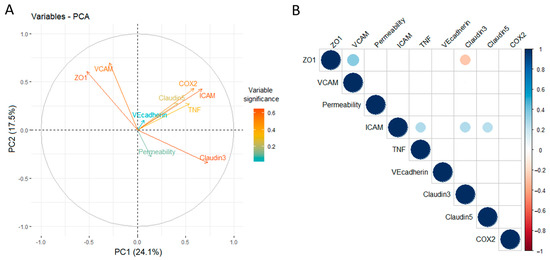 Exploratory analysis of data generated from treatment of BLECs with donor plasma. Plasma was obtained from n = 30 IBD patients and 30 healthy donors matched by age and sex. BLECs were treated with 10% plasma for 24 h and permeability to NaFlu, and expression of proteins by Western blotting were assessed. PCA of these parameters alongside TNFα levels in donor plasma was carried out, and loading plots of assessed parameters are shown (heat scale at the side of the graph indicate numerical significance to the model of the assessed parameters) (A). A correlation matrix correlating all assessed parameters was also generated (only correlations of p value < 0.05 are shown, this being represented by circles of larger size, the smaller the p value is; the heat-scale at the side of the graph indicates in blue whether significant correlations are positive or in red in case correlations are negative) (B).