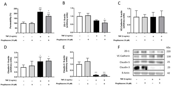 Effects of pioglitazone on TNFα-induced permeability alterations and junctional protein expression. BLECs were treated with 5 ng/mL of TNFα for 24 h following pre-treatment with 10 µM pioglitazone for 24 h. Permeability to NaFlu (A) and expression of junctional proteins ZO1, VE-cadherin, claudin-5 and claudin-3 by Western blotting (B–F) were assessed. Results are shown as mean ± standard deviation (n = 4) and were analyzed via one-way ANOVA followed by Tukey’s post hoc test. *, *** p < 0.05 and 0.001 in comparison to control groups; # p < 0.05 in comparison to TNFα-treated group. Permeability value of controls = 0.65 ± 0.09 × 10−3 cm/min.