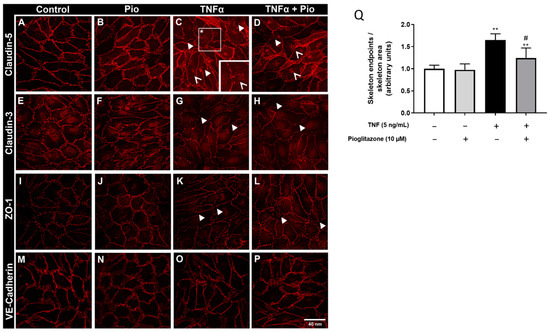 Effects of pioglitazone on TNFα-induced disarrangement of junctional proteins. BLECs were treated with 5 ng/mL of TNFα for 24 h following pre-treatment with 10 µM pioglitazone for 24 h. Filters from transwell inserts were collected, antibody-stained and mounted on glass slides. Visual inspection of organization of junctional proteins was assessed by immunofluorescence under a confocal microscope (100×) (A–P). Immunofluorescence images of claudin-5 were processed on CellProfiller® software, and skeleton endpoint ratios (total “filled” skeleton area by the actual skeleton area) were assessed (Q). Scale bar = 40 nm. Thick white arrowheads represent segments of claudin-5 discontinuation; thin white arrowheads represent points of claudin-5 resorption; the image at the corner in C represents a higher magnitude (500×) amplifying the area denoted by a white box containing an asterisk. Results are shown as mean ± standard deviation (n = 4) and were analyzed via one-way ANOVA followed by Tukey’s post hoc test. ** p < 0.01 in comparison to control groups; # p < 0.05 in comparison to TNFα-treated group.