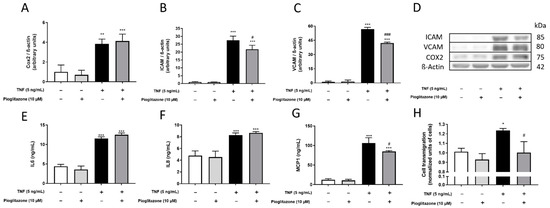 Effects of pioglitazone on TNFα-induced increases in inflammation-associated factors and monocyte transmigration. BLECs were treated with 5 ng/mL of TNFα for 24 h following pre-treatment with 10 µM pioglitazone for 24 h. Expression of inflammatory proteins COX-2, VCAM-1 and ICAM-1 were assessed by Western blotting (A–D). Co-culture supernatants were collected, and secretion of IL-6, IL-8 and MCP1 by endothelial cells was assessed by ELISA (E–G). Stained monocytes were co-cultured alongside BBB co-cultures, and their transmigration was assessed via colorimetric assays (H). Results are shown as mean ± standard deviation (n = 3) and were analyzed via one-way ANOVA followed by Tukey’s post hoc test. *, **, *** p < 0.05, 0.01 and 0.001 in comparison to control groups; #, ### p < 0.05 and 0.001 in comparison to TNFα-treated group.