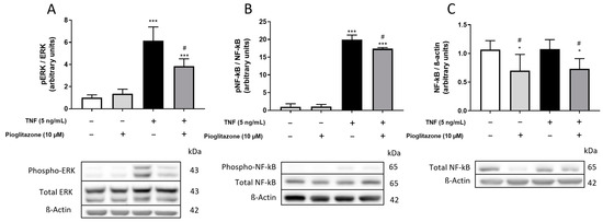 Effects of pioglitazone on TNFα-induced phosphorylation of ERK and NF-kB. BLECs were treated with 5 ng/mL of TNFα for 30 min following pre-treatment with 10 µM pioglitazone for 24 h; phosphorylation of ERK and NF-kB was assessed by Western blotting (A,B). Endothelial cells were also treated with 5 ng/mL of TNFα for 24 h rather than 30 min following pre-treatment with 10 µM pioglitazone for 24 h; expression of total NF-kB was assessed by Western blotting (C). Results are shown as mean ± standard deviation (n = 4) and were analyzed via one-way ANOVA followed by Tukey’s post hoc test. Representative bands are aligned with treatment order as denoted below graphs. *, *** p < 0.05 and 0.01 in comparison to control groups; # p < 0.05 in comparison to TNFα-treated group.