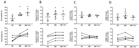 Effects of pioglitazone on BBB alterations induced by plasma from IBD patients. BLECs were treated with plasma from healthy donors and IBD patients at a 10% concentration for 24 h following pre-treatment with 10 µM pioglitazone for 24 h. Permeability to NaFlu through the endothelial barrier (A) and expression of junctional proteins claudin-5 (B), inflammatory protein COX-2 (C) and adhesion molecule ICAM-1 (D) by Western blotting were assessed. Results from an experiment utilizing 5 different donor pairs (n = 5) are shown as mean ± standard deviation at the upper brackets and as paired associations in the lower bracket. Data were analyzed via repeated-measures ANOVA followed by Dunn’s post hoc test. * p < 0.05 in comparison to healthy donor group. HD, healthy donor plasma; IBD, patient plasma; IBD + Pio, patient plasma plus pioglitazone added during the treatment. Permeability value of controls = 0.58 ± 0.050 × 10−3 cm/min.
