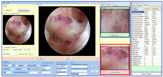 The methodology components used to accomplish the computer-assisted tissue image analysis during minimally invasive gynecological surgery (MIGS) are presented below. Figure 1 presents a screenshot of a CAD system allowing the physician to crop normal and abnormal ROIs in the course of a hysteroscopy examination procedure. In addition, the corresponding ROI texture features are tabulated on the right side.