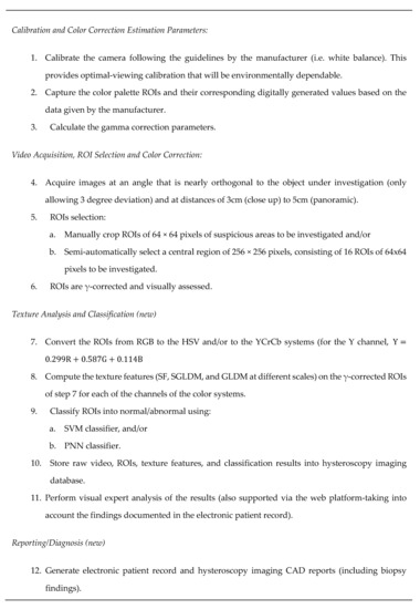 Hysteroscopy imaging CAD protocol covering image calibration and color correction, video acquisition, texture analysis and classification, and diagnosis. This protocol was updated from protocols previously published by our group in [8].