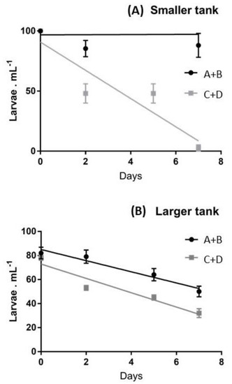 This representation permits the evaluation that in smaller tanks, during the first week, an 100% survival was exhibited by larvae deriving from females A and B, whilst, in the same period, females C and D produced a decline of larvae, down to 2.6% of the initial pool. When slopes were compared, the differences in the survival patterns of the two larval pools were significant at p < 0.05. In larger tanks a continuous decrease of the swimming larvae was observed during the first week for both larval pools (Figure 2B) and the differences in the survival patterns of the two larval pools were not significant (p > 0.05).