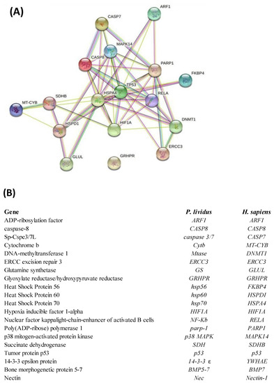 (A) Interactomic analysis by STRING (https://string–db.org/; accessed on 30 April 2022). The network graphically displays the relationship between genes. The biological relationships between genes are indicated by different colors. Known interactions: reported by database = light blue and determined experimentally = pink. Expected interactions: gene proximity = green; gene fusion = red; and genes with similar pattern = light blue. (B) Homo sapiens gene names and the corresponding P. lividus orthologous genes. The most significant relations among genes (confidence score cut-off = 900) displaying experimental evidence are highlighted.