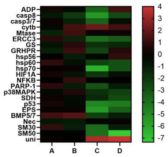 Heatmaps (Heatmapper available at www.heatmapper.ca, accessed on 28 July 2022) showing the expression profiles and hierarchical clustering of twenty-three genes analyzed by Real Time qPCR in P. lividus embryos deriving from females A, B, C and D. Color code: red = up-regulated genes with respect to the control; green = down-regulated genes.