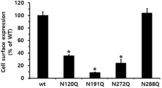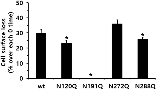 Specifically, the surface loss of the receptor was not observed in the cells expressing the eel FSHR-N191Q mutant. The loss of cell surface receptors at 30 min decreased remarkably in the eel FSHR-wt (30%) compared to that in the cells without the agonist treatment (0% cell surface receptor loss) (Figure 6). In the cells harboring the N120Q and N288Q mutants, the surface loss of the receptors was decreased by 23% and 26%, respectively, compared to that observed in the eel FSHR-wt at 30 min post-agonist treatment.