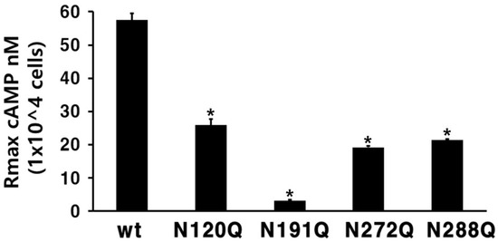 Rmax levels in the N-linked glycosylation mutants. The maximal cAMP responses presented in Figure 3 are displayed using a bar graph. * Statistically significant differences (p < 0.05) compared to the Rmax level of the eel FSHR-wt.
