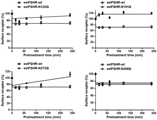 Time-dependent cell surface loss in the eel FSHR-wt and N-linked glycosylation mutants. Cell surface expression in the non-pretreated groups was taken as 100%. Mean data were fitted to the one-phase exponential decay equation (see Section 4). The blank circles are the same curves of eel FSHR-wt.