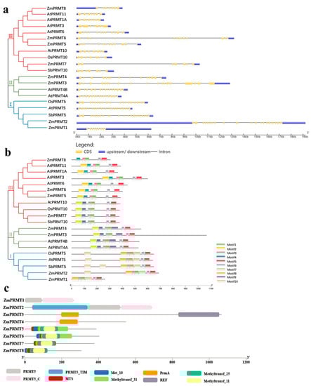 To identify all possible orthologs of PRMT gene family in maize, we took the PRMT genes in Arabidopsis, rice and sorghum as homologous reference genes and carried out the following analysis. The whole-genome sequences of maize were downloaded from the maize genomic database (http://www.maizesequence.org/index.html) (accessed on 5 September 2021) by referring to our previous studies []. The BLASTP program (p-value < 1 × 10−5) was used to confirm proteins containing PRMT domain from the maize genomic database using the published eight Arabidopsis PRMTs (AtPRMTs), two rice PRMTs (OsPRMTs) and two sorghum PRMTs (SbPRMTs), with sequences of their proteins and PRMT domains as queries, respectively. The information of PRMT genes in these plants were listed in Supplementary Table S1. The Hidden Markov Model (HMM) program was used to identify putative PRMT protein sequences in maize genome database, which was downloaded from the SMART database (http://smart.embl-heidelberg.de/) (accessed on 3 September 2021) and Pfam database (http://pfam.xfam.org/) (accessed on 3 September 2021) [,]. Redundant protein sequences were removed manually by searching against the SMART database and the NCBI database (https://www.ncbi.nlm.nih.gov) (accessed on 3 September 2021). The newly identified genes were assigned by referring to the subfamily classification order of this gene family, combined with their phylogenetic relatedness to orthologous proteins of PRMTs in Arabidopsis, rice and sorghum. Then, the genome-wide files of maize B73 genome were downloaded to obtain the basic information of each PRMT gene from the maize genomic databases, including the length of CDS, the number of amino acids and the location of chromosomes. The physicochemical parameters of these putative proteins, including molecular weight (kDa) and isoelectric point (pI), were calculated using the online calculation pI/Mw tool ExPASy (http://www.expasy.org/tools/) (accessed on 10 September 2021), and the parameter was set to average []. Other relevant information was collected from the NCBI database. Similarly, the protein sequences of corresponding orthologs in Arabidopsis, rice and sorghum were also retrieved, and a dataset was created for bioinformatics analysis.