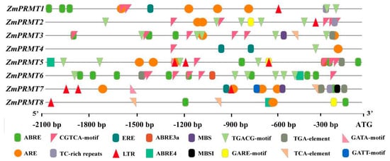 To investigate the position of genes on chromosomes and their possible functions, we completed the localization and cis-acting element analysis. The chromosome location of maize PRMT genes was obtained from the maize genomic database. The online mapping tool MG2C (http://mg2c.iask.in/mg2c_v2.0/) (accessed on 13 September 2021) is used to generate chromosome localization image of maize PRMT genes. In addition, the cis-acting elements in the promoter sequences can be involved in regulating gene transcription in abiotic stress responses, which depends on binding to different transcription factors. The 2 kb sequences upstream of the initiation codon (ATG) of each ZmPRMT gene were downloaded from the phytozome database (https://phytozome.jgi.doe.gov/pz/portal.html) (accessed on 13 September 2021) to further investigate the potential regulatory elements. The stress- and hormone-related cis-acting regulatory elements in promoter regions of PRMT genes in maize were analyzed by using the PlantCARE database (http://bioinformatics.psb.ugent.be/webtools/plantcare/html) (accessed on 13 September 2021) [].