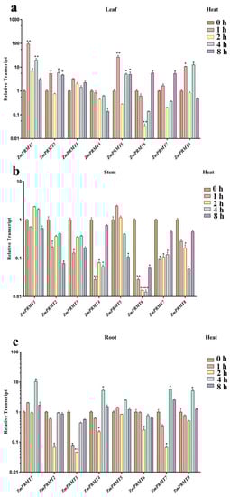 To further confirm the responsiveness of ZmPRMT genes to abiotic stresses, the expression profile of these eight genes was further explored by qRT-PCR analysis and with at least three biological repeats to make sure the reliability of the qRT-PCR results. The experiment was accomplished by using the cDNA of leaves, stems and roots of maize seedlings, which were exposed to three diverse abiotic stress treatments, including heat, drought and salt. Firstly, the different maize tissues (including leaves, stems and roots) at five different time points (0 h, 1 h, 2 h, 4 h and 8 h) under heat stress treatment were collected to investigate the transcription levels of these eight ZmPRMT genes by using qRT-PCR, respectively (Figure 5). Firstly, the expression levels of these eight ZmPRMT genes in maize leaves, stems and roots at five different time points (0 h, 1 h, 2 h, 4 h and 8 h) after heat treatment were detected by qRT-PCR analysis. After heat treatment, these eight ZmPRMT genes displayed differential accumulation of expression levels. One of the most obvious results we can observe is that the majority of ZmPRMT genes exhibited differential upregulated expression levels in leaves after heat treatment, whereas only one ZmPRMT gene (ZmPRMT5) in stems and two ZmPRMT genes (ZmPRMT1, ZmPRMT5) in roots showed the significantly upregulated expression levels after heat treatment compared with those in leaves. Only two ZmPRMT genes (ZmPRMT4 and ZmPRMT6) in leaves didn’t show upregulation after heat stress at different time points, while the others exhibited upregulation in leaves at distinct time hours, indicating that most of these ZmPRMT genes may play potential roles in heat stress responses. Moreover, under heat treatment, the majority of these ZmPRMT genes showed more obvious responses in leaves than those in stems or roots. Based on the above analysis, it can be speculated that the ZmPRMT genes in leaves might be involved in heat stress responses of plants and more sensitive than those in steams and roots. Therefore, these results indicate that plant leaves rather than stems and roots may be the main organs of plants in heat stress responses. Moreover, it is noticeable that the upregulated expression patterns of ZmPRMT1 and ZmPRMT5 in all the three different tissues revealed that these two genes might play crucial roles in maize in response to heat stress.