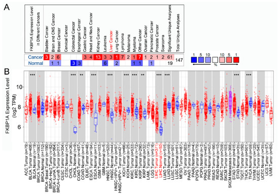 The FKBP1A expression levels in various types of cancer tissues indicated by mRNA detection. (A) The expression level of FKBP1A in different types of tumor tissues and normal tissues in the Oncomine database. Number listed under name of each tumor is sample number (n) recorded in each dataset. Red highlight indicates high expression and blue indicates low expression. Darker red or darker blue represents higher or lower expression, respectively. (B) The expression levels of FKBP1A in different types of tumor tissues queried from the TCGA Oncomine tumor database and normal tissues via TIMER2.0 database analysis. ** p < 0.01, *** p < 0.001.