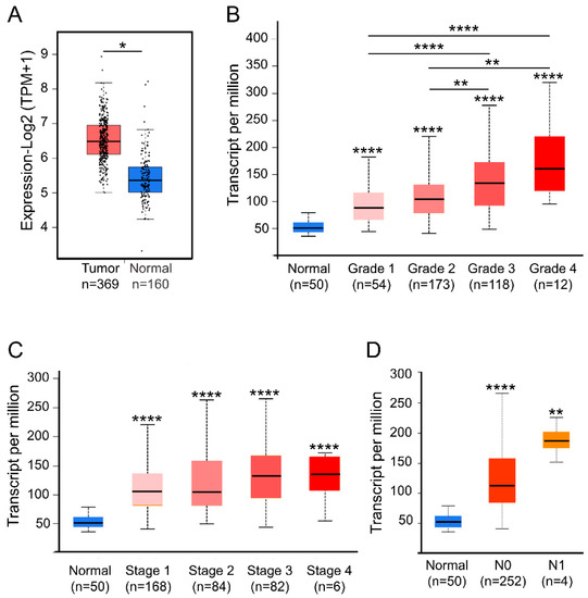 - Chandrashekar, D.S.; Bashel, B.; Balasubramanya, S.A.H.; Creighton, C.J.; Ponce-Rodriguez, I.; Chakravarthi, B.; Varambally, S. UALCAN: A portal for facilitating tumor subgroup gene expression and survival analyses. Neoplasia 2017, 19, 649–658. [Google Scholar] [CrossRef] [PubMed]
