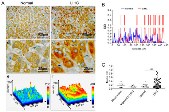 Human tissue microarray including hepatocellular carcinoma and normal liver tissue analysis revealed that the expression of FKBP1A was significantly elevated in LIHC patients. (A) Representative IHC images of FKBP1A in normal liver (a) or LIHC patients (b). (c) Shows the enlarged image of the black box in (a); (d) is the enlarged image of the black box in (b). The density distribution of (c,d) are shown in panels (e,f). n (normal) = 16; n (LIHC) = 79. (B) The plot profiles of the intensity of FKBP1A protein in hepatocytes of normal tissues and LIHC along the straight line (as shown (a) and (b). (C) Quantification of the mean optical density (mean IOD) of FKBP1A protein by IHC staining in healthy liver, adjacent to LIHC or LIHC tissues. The normal group includes healthy liver and adjacent to LIHC tissues. n (healthy liver) = 6; n (adjacent to LIHC) = 10; n (normal) = 16; n (LIHC) = 79. Data are presented as the means ± SD. *** p < 0.001.