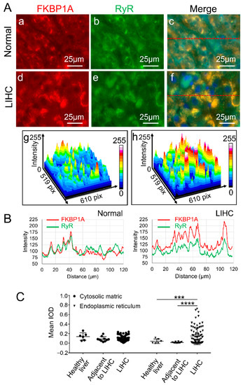 Interestingly, our immune-histochemical analysis of the association of FKBP1A expression also unveiled a significant alteration in tumor cellular distribution and the accumulation of FKBP1A protein in ER. In normal hepatic cells, the FKBP1A expression is evenly distributed in the cytosolic matrix without significant cellular distribution or slightly uneven differences (Figure 3A(a,c,e),B and Figure 4A(a,b,c)). However, during the development of LIHC, the cellular distribution in hepatic cells becomes uneven within the cytosolic matrix and concentrates on peri-nuclear localization. Along with the cytosolic increase in FKBP1A expression during growing severity, more and more FKBP1A protein accumulated within the LIHC ER condensing in peri-nuclear localization from normal hepatic cells to LIHC (Figure 3A(b,d,f) and Figure 4A(d,e,f),C). As the cellular FKBP1A protein is recognized as the regulator of ER RyR and IP3R, it is certain that this intra-ER accumulation of the FKBP1A (Figure 4A–C) will extinguish its cellular function, targeting RyR- and IP3R-mediated intracellular calcium pathways.