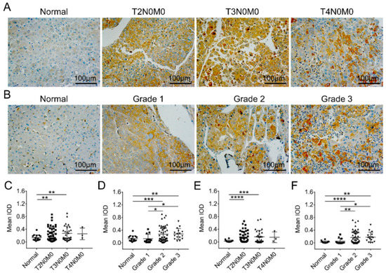 In addition, our immune-histochemical analysis of the association of FKBP1A expression with tumor-node-metastasis (TNM) stage and tumor histologic grade in patients with LIHC unveiled a significant increase along with the developing severity of LIHC. The FKBP1A protein expression was significantly upregulated in T2N0M0 or T3N0M0 tumors (Figure 5A,C) and grade 2 or 3 tumors (Figure 5B,D) compared with normal liver tissues. There was no significant difference in FKBP1A protein expression in advanced tumors compared to early-stage tumors (p > 0.05, Figure 5C). However, the relative expression of FKBP1A protein was higher at tumor grade 2 and 3 than that at grade 1 (Figure 5D). Moreover, the FKBP1A protein expression in ER was also significantly upregulated in T2N0M0 or T3N0M0 tumors (Figure 5E) and grade 2 or 3 tumors (Figure 5F) compared with normal liver tissues. The distribution of FKBP1A expression in the ER also increased significantly with the increase in tumor grade (Figure 5F). These results indicate that increased FKBP1A level is associated with severity in the development of LIHC, which indicates its key role in LIHC tumorigenesis.