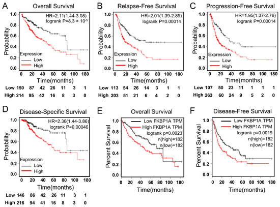 To enhance the understanding of the correlation for the potential mechanism of FKBP1A gene expression in liver cancer, we further analyzed the correlation between FKBP1A expression and various clinical characteristics in LIHC patients using the Kaplan–Meier plotter. The analysis revealed that the overall survival (Figure 6A, HR = 2.11, 95% CI = 1.44 to 3.08, Logrank p = 8.3 × 10−5), relapse-free survival (Figure 6B, HR = 2.01, 95% CI = 1.39 to 2.89, Logrank p = 0.00014), progression-free survival (Figure 6C, HR = 1.95, 95% CI = 1.37 to 2.76, Logrank p =0.00014), and disease-specific survival (Figure 6D, HR = 2.36, 95% CI = 1.44 to 3.86, Logrank p = 0.00046) were significantly reduced when the expression level of FKBP1A was high in the patients.
