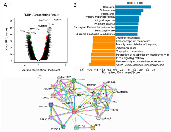 As shown in the volcano plot (Figure 7A), 7206 genes (dark red dots) showed significant positive correlations with FKBP1A, whereas 5234 genes (dark green dots) showed significant negative correlations (false discovery rate [FDR] < 0.01). The three most significant genes positively associated with FKBP1A expression were TMSB10 (positive rank #1, r = 0.7252, p = 8.844 × 10−62), IPTA (r = 0.704, p = 8.577 × 10−57) and SNRPB2 (r = 0.68, p = 1.15 × 10−51) (Supplementary Figure S1A). The other three most significant negatively associated genes were MYO18A (negative rank #1, r = −0.6654, p = 1.307 × 10−48), NFIC (r = −0.6425, p = 1.428 × 10−44) and TOM1L1 (r = −0.6422, p = −1.569 × 10−44) (Supplementary Figure S1B). The top 50 significant genes positively and negatively correlated with FKBP1A are also shown in the heat map (Supplementary Figure S2A,B).