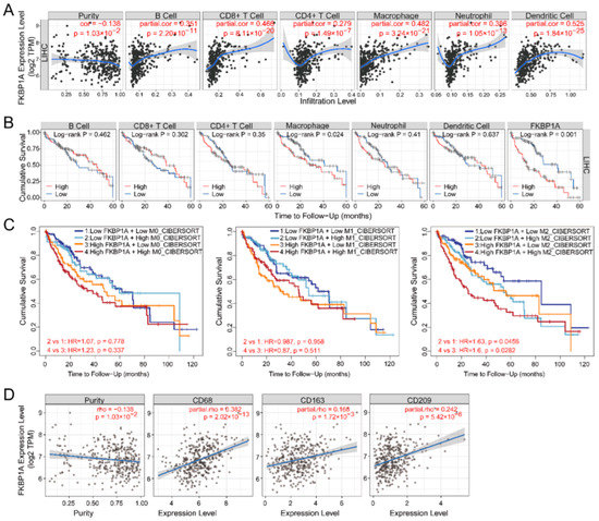 To date, increasing investigation of the tumor immune microenvironment has transformed the precision of the medical treatment of cancer. Regarding LIHC development associated with an inflammatory environment, the FKBP1A protein could be involved in the immune microenvironment of LIHC, based on bioinformatics analysis. The expression level of FKBP1A was significantly positively correlated with the infiltration of various immune cells (B cells, CD4+ T cells, CD8+ T cells, macrophages, neutrophils, and dendritic cells). The patients with higher M2 macrophage infiltration indicated an unfavorable prognosis; FKBP1A expression was markedly positively correlated with biomarkers of the M2 macrophages. These findings indicated that tumor immune cell infiltration, in particular M2 macrophages, might partially account for FKBP1A-mediated oncogenic roles in LIHC. The M2-polarized macrophages could be tumor-associated macrophages (TAMs). TAMs could be a major component of the tumor microenvironment. The TAMs are associated with tumor growth, metastasis and progression via the induction of extracellular matrix remodeling, angiogenesis, and therapeutic resistance [28]. Increasing studies have shown that the infiltration of M2 macrophages in the microenvironment of liver tumor indicates poor prognosis. The M2 macrophages promote liver tumor growth, epithelial-mesenchymal transition, migration and invasiveness [29,30,31]. Therefore, we claim that high FKBP1A expression resulting in poor prognosis may regulate tumor immune cell infiltration into the immune microenvironment of LIHC, especially represented by M2 macrophages. According to our data, there is increased expression of FKBP1A in dendrite cells and M2 macrophages of peripheral blood in LIHC. It could be possible that collecting and evaluating the FKBP1A expression in patients’ peripheral blood may be a practical approach for clinical therapeutic diagnostics.