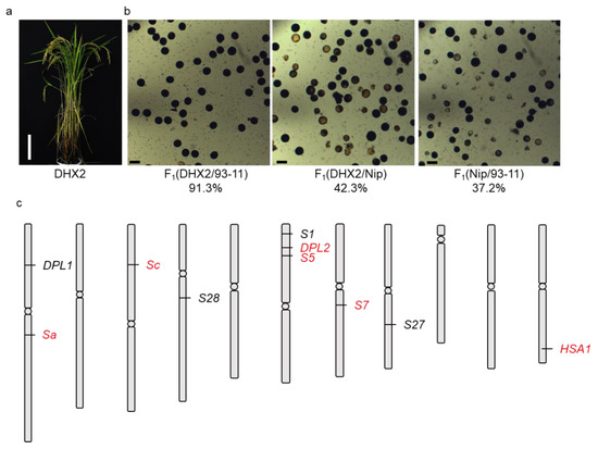 DHX2 exhibited hybrid sterility when crossing with other GJ varieties (a) The plant architecture of GJ variety DHX2. Scale bar: 20 cm; (b) The pollen phenotypes of F1 plants derived from the cross of DHX2/93-11, DHX2/Nip, and Nip/93-11. Scale bar: 50 μm; (c) The loci for hybrid sterility. The loci that have been cloned from XI/GJ cross were highlighted in red color.