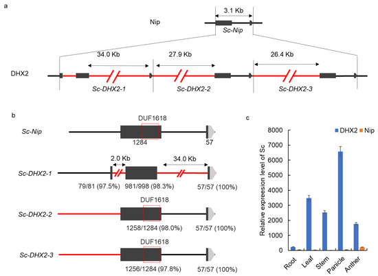 , and Sc-DHX2-3) in DHX2 (Figure 3a). The Sc-DHX2-1 shared a similar promoter sequence to Sc-Nip, but lost the DUF1618 domain due to the 2.0 kb insertion in the first exon and a 34.0 kb insertion at the intron of Sc-DHX2-1. Thus, we concluded that the Sc-DHX2-1 is a pseudogene. The other two copies, Sc-DHX2-2 and Sc-DHX2-3, each contain the entire sequence of Sc-Nip. However, there are several SNPs in the exon of Sc-DHX2-2 and Sc-DHX2-3 compared to that of Sc-Nip. The first exon of Sc-Nip contains 1284 bp, the first exon of Sc-DHX2-2 was 98.0% (1258/1284), identical to Sc-Nip, and the first exon of Sc-DHX2-3 was 97.8% (1256/1284), identical to Sc-Nip (Figure 3b). We then checked whether the extra copies of Sc were altering the expression pattern and expression level of Sc. The RT-PCR showed that Sc was specifically expressed in anther with a low level in Nip, whereas, they were broadly in leaf, stem, panicle, and anther, with a significantly higher level in DHX2 compared to Nip (Figure 3c). Thus, we hypothesized that the copy number variation at the Sc locus in DHX2 conferred the F1 hybrid sterility when DHX2 was crossed to other typical GJ varieties.