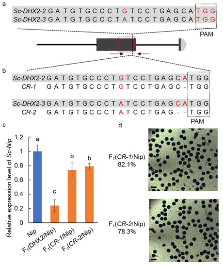 The CRISPR/Cas9 gene editing of the extra copy of Sc in DHX2. (a) The sgRNA sequence of Sc-DHX2-2 and Sc-DHX2-3. The red dash line box indicates the DUF1618 domain; (b) the sequence of two mutant lines; (c) the expression level of Sc-Nip in the anthers of the F1 plants. Different letters denote significant differences (p < 0.05) from Duncan’s multiple range tests; (d) the pollen phenotypes of F1 plants derived from the cross of CR-1/Nip and CR-2/Nip. Scale bar: 50 μm.