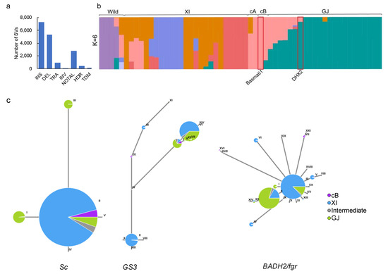 The population structure analysis of 58 assemblies. (a) The different types of SVs between DHX2 and Nip. INS: insertion, DEL: deletion, TRA: translocation, INV: inversion, NOTAL: not aligned region, TDM: tandem repeat, HDR: highly diverged regions; (b) Structure analysis of 58 accessions with different numbers of clusters, K = 6. The different colors represent different groups of rice accessions. (c) Haplotype network of Sc, GS3, and BADH2/fgr using sequence data of the 3000 Rice Genomes Project. Circle size is proportional to the sample number for a given haplotype. Different colors represent ecotypes, as shown in the illustration. Different Roman numerals indicate various haplotypes of Sc, GS3, and BADH2/fgr.