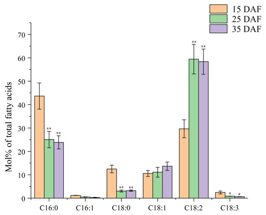 Fatty acid profiles of cotton seeds at three development stages (15DAF, 25DAF and 35DAF). Fatty acid level (mol%) was presented as a percentage of all fatty acids. Values are the mean ± SE of six biological duplicates. “*” and “**” represent statistically significant differences (p < 0.05 and p < 0.01) between the fatty acid level in the 15 DAF and the value in the 25 or 35 DAF seeds, based on two-tailed Student’s t tests.